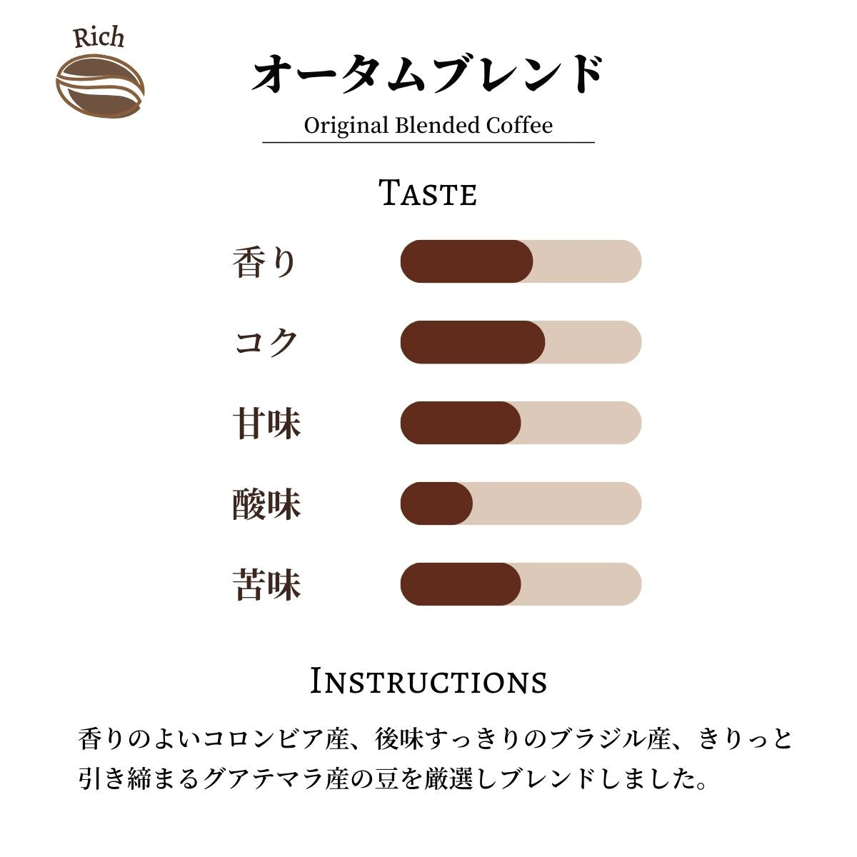 香りのよいコロンビア産、後味すっきりのブラジル産、きりっと引き締まるグアテマラ産の豆を厳選しブレンドしました。コクの中にあるクリーンな味わいをお楽しみください。