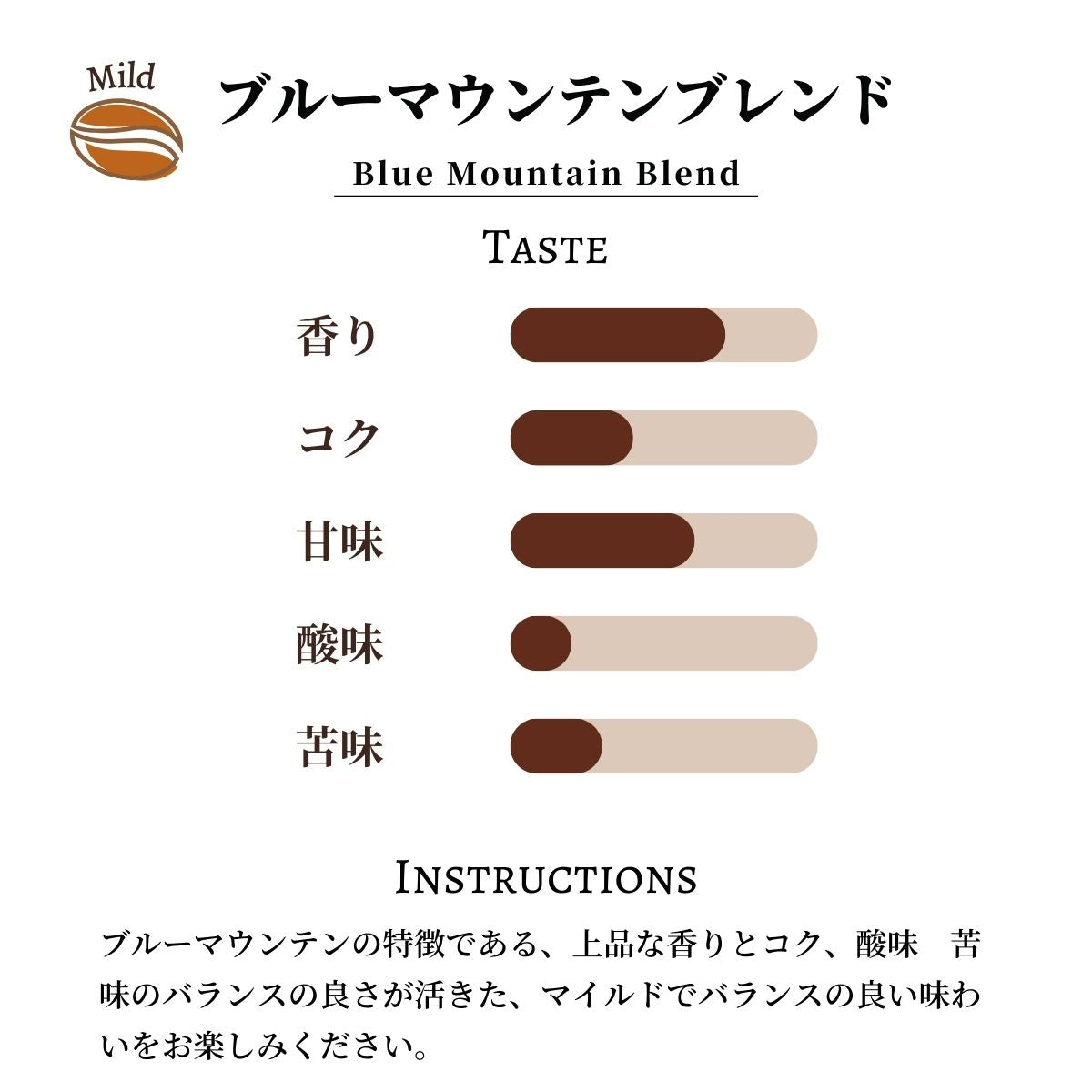 ジャマイカ産最高級豆のブルーマウンテンNo.1を生豆換算で30%以上配合し、南米、アジア産コーヒーとブレンドしました。ブルーマウンテンの特徴である、上品な香りとコク、酸味、苦味のバランスの良さが活きた、マイルドでバランスの良い味わいをお楽しみください。
