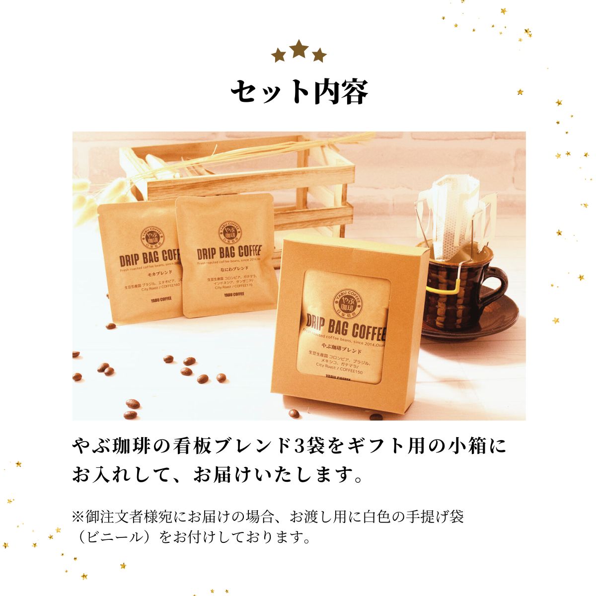 やぶ珈琲で作る自家焙煎&自家製ドリップコーヒーギフトです。